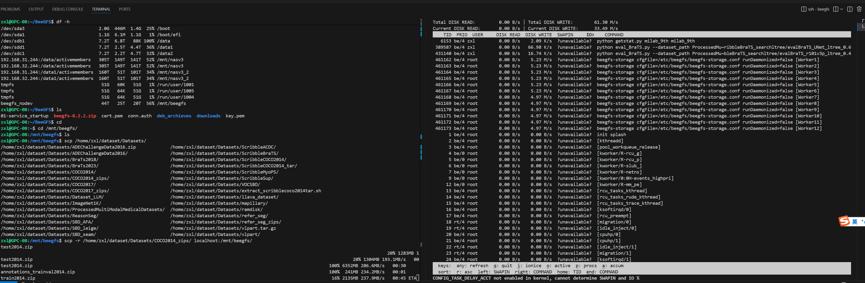 右侧是9号机的负载,左侧是8号机的网络负载,可以看到大文件拷贝速度在234M/s差不多能吃满万兆,单个节点的网络在33M/s,说明beeGFS自动均衡了网络负载。